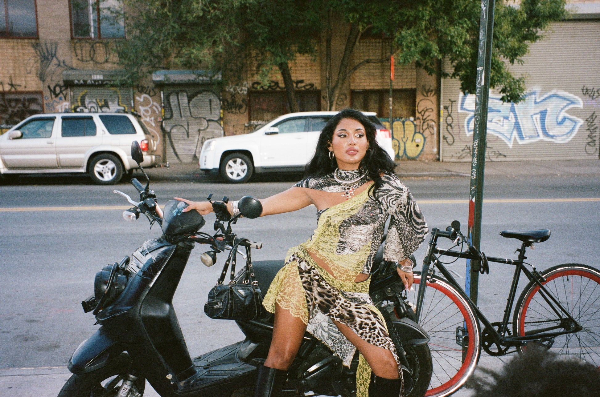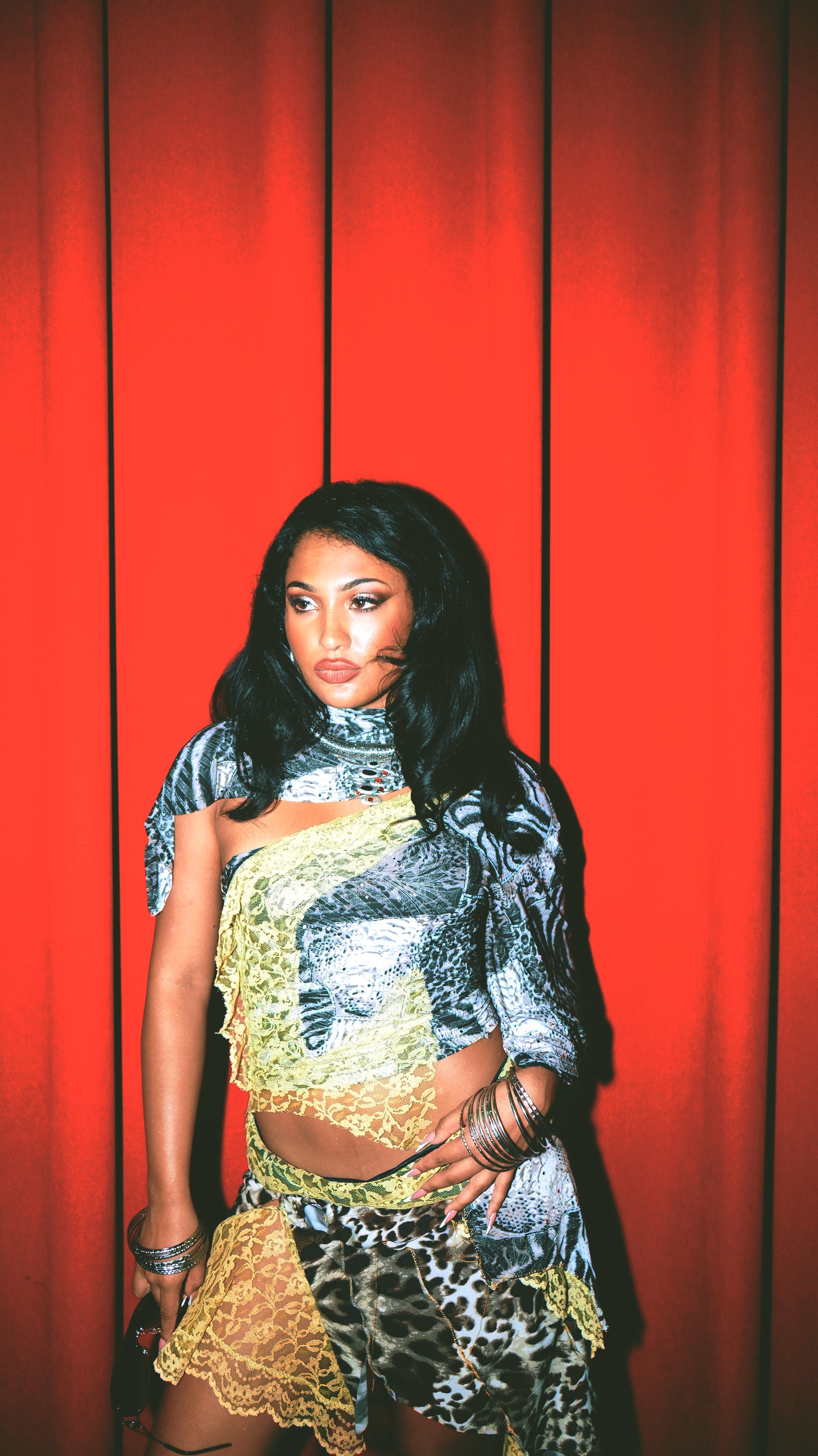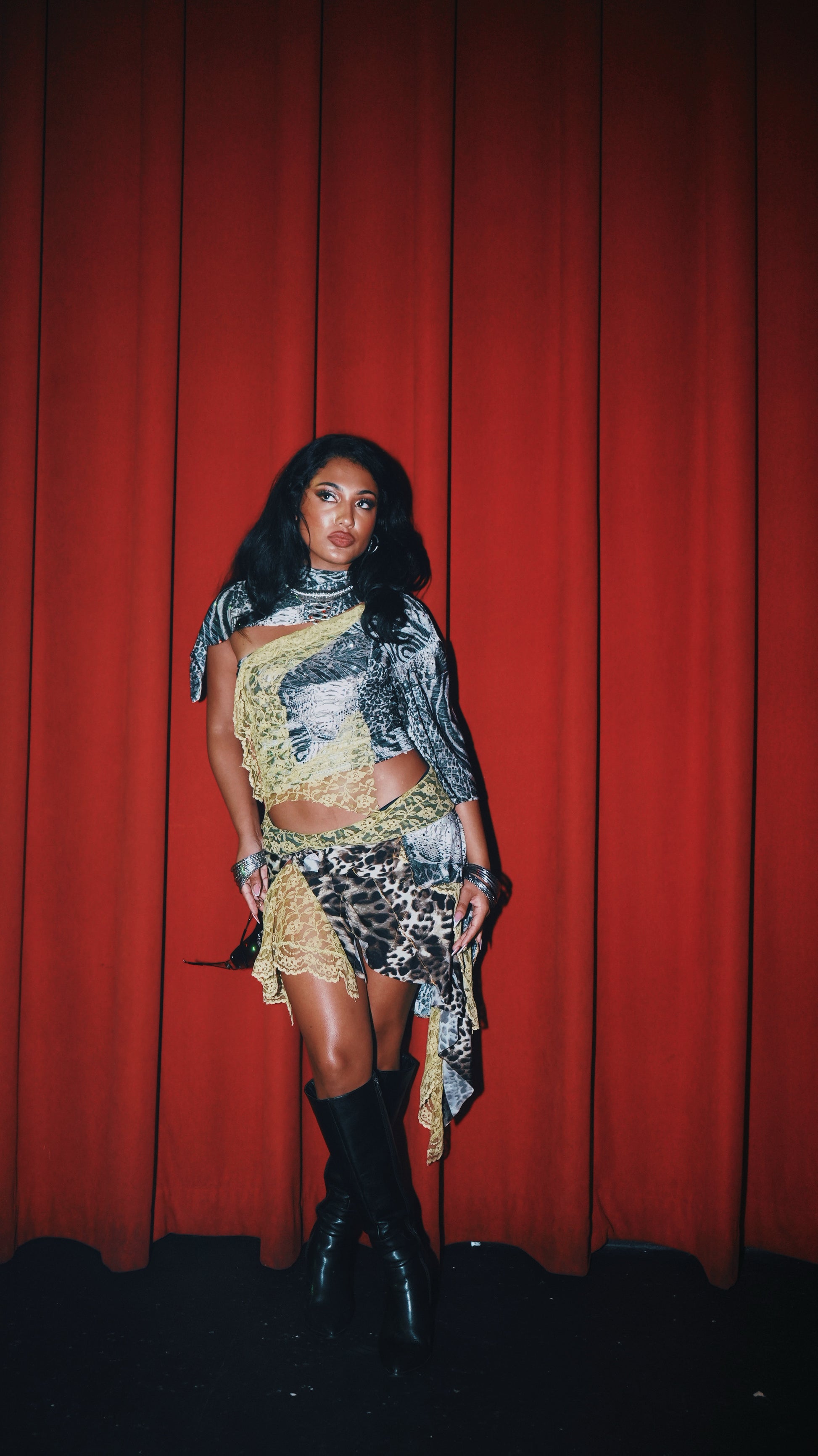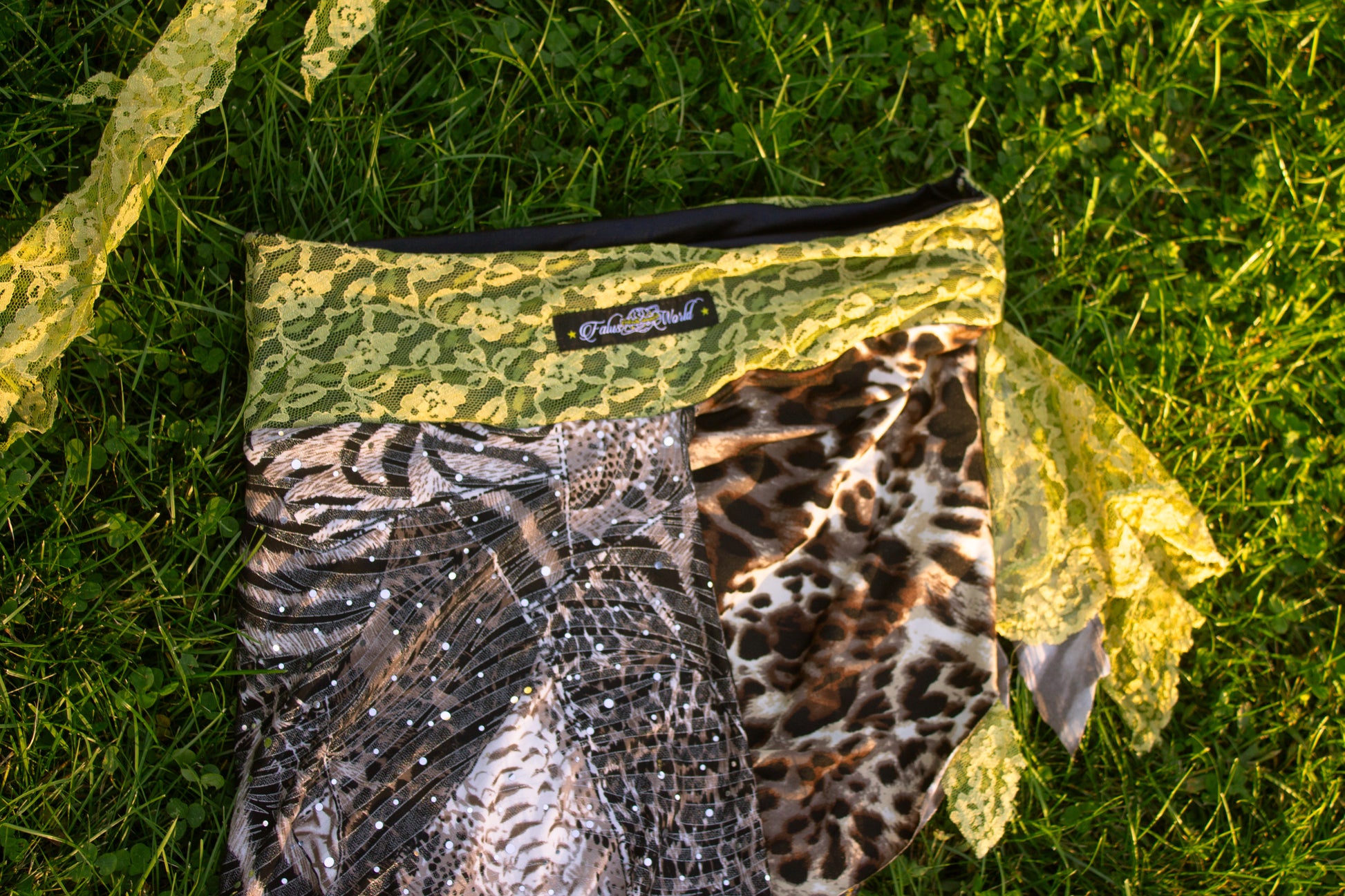 One-of-one top and skirt set made from repurposed materials, inspired by trees of the forest.
